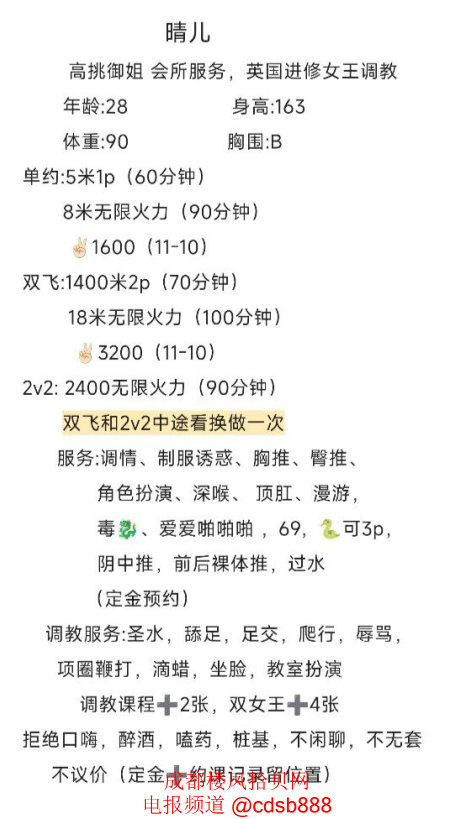 天府三街B0624晴儿,30岁左右的少妇,黑丝高跟职业包臀裙,大长腿,口活很好,逼会夹,姿势配合,骚浪,有毒龙,可录视频,可双飞,可3P,可2VS2,可SM调教,500元一次,有不限次套餐,可包夜