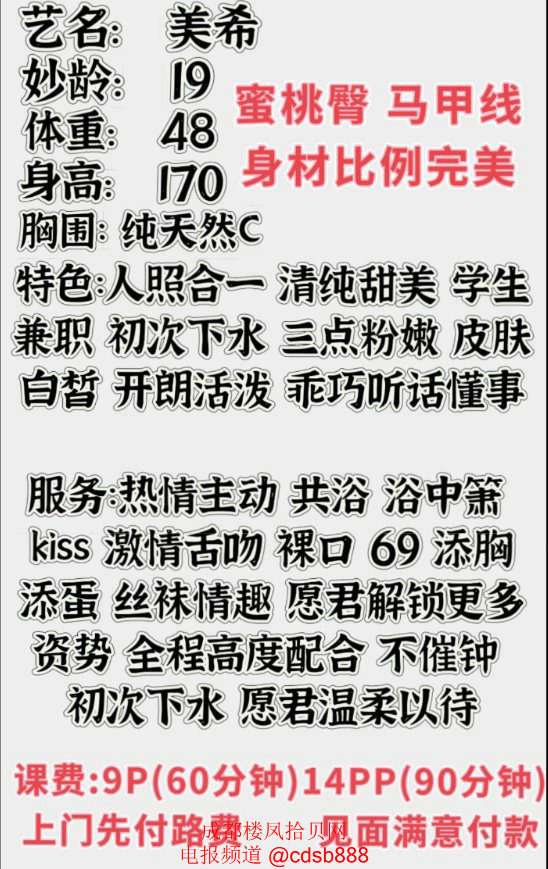 天府二街B0640美希,来自安徽的19岁嫩妹,个子高(170cm),长得乖,漂亮,皮肤白,性格好,开朗健谈,敏感,态度好,配合,身材好,有马甲线,可舌吻,900元一次,可上门