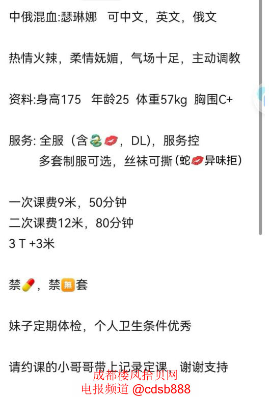 【服务详情】:在成都找到8p的洋马可太难得了,刷到了就第一时间约到了老师,遥控上楼,一进门老师穿着情趣蕾丝,甜甜的微笑相迎,给了我一个个大大的hug,身体很温暖,环顾四周观察了下环境,是一个高层酒店,城市景观一览无余,房间内是暖色氛围灯和装饰气球,装饰很美观。我迫不及待解衣沐浴,躺上床,老师也洗完换一身更刺激的情趣内衣,过来和我进行亲密接触。先是紧紧拥抱着?,然后老师的红唇调皮的移到我的耳朵,舔的心痒痒的,又漫游到我的胸膛,挑弄我的乳头,另一只手也不闲着,抓着我的二弟玩弄。然后就是给我口,不得不说老师口技了得,还会表演欧美区那种deep throat。接着我边玩着奶子边舔b,下面刮过毛很干净,因为我玩的3T,又忍不住轻轻舔舐她的皮燕,老师被我舔的受不了,又说要跟我玩sixty nine(69),然后我又要求老师给我做DL,也是愉悦答应……一番翻云覆雨,老师一口一个honey,叫的我心痒痒的,盯着老师碧蓝的双眼,二弟在老师的批和皮燕里来回捣(不用换套),相当刺激爽快。不得不说老师真是无所不能啊,一夜之间带我第一次体验洋马、深喉、3T,想体验洋马的兄弟不可错过哦~哦对了,老师英语中文都会说,不用担心沟通障碍