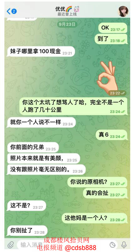 我是通过优优的代聊的电报号约的,不是通过她本人的微信号约的,我去了见到本人了,完全就是照骗浪费时间,这条信息中的所谓原相机视频人照只有1分像,超级无敌高p视频。和代聊的聊天截图如下:
