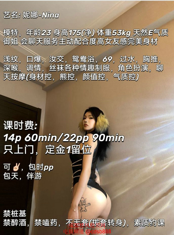 [只上门] 只上门的YX0064妮娜(Nina),御姐,新疆混血,颜值高,个子高(175cm),有时长发有时短发,可舌吻,皮肤白,纹身多,胸大E罩(巨乳)不下垂,双腿修长又饱满,身材线条好,肥臀,腰臀比好,水多,女上位技术好,口活可不用手且眼神勾人,眼睛大,灵魂有趣,1400元一次,可包时,可伴游,可包天,可包夜