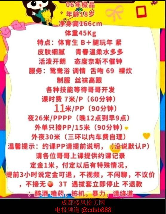 【个人发挥】:出差成都 连续cj了多个围子 状态确实不好 打开电报偶然发现以前关注过的妹子开了,抱着来都来了,打好最后一仗的准备。提前到达场所,结果妹子都还没到 等了差不多快一个小时 遥控上门。颜值不错 开个中肯定没问题 胸有点小A吧 本来我也是抱着打个卡的态度来的 但是妹子还是很能聊还带一点憨。声音不是那种甜妹的声音有点小学生的感觉。因为状态不好 后面也没出来但是妹子也没催 还有点俏皮使劲扯我 把我当路飞的整。皮肤有点黑 妹妹还羡慕我的皮肤白🤣