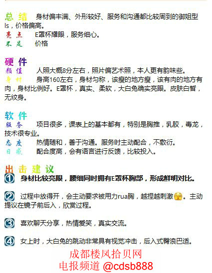 总结:服务比她好的没她身材巴适(特别是胸),身材比她好的没有这么多服务。价格方面就见仁见智了,毕竟到这个价位了。