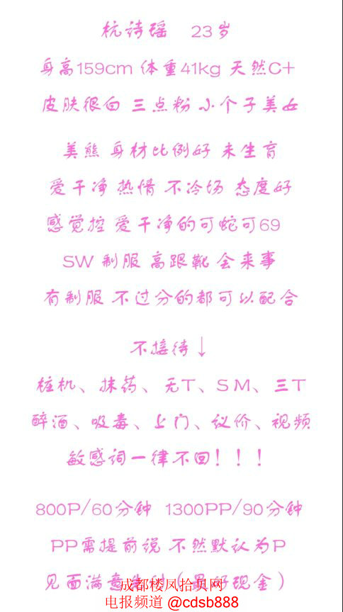 金融城杭诗瑶,身材娇小,158高80斤重,长得可以,小乖小乖,胸b+,皮肤白,可舌可69,会找话题,会提供情绪价值800/1300