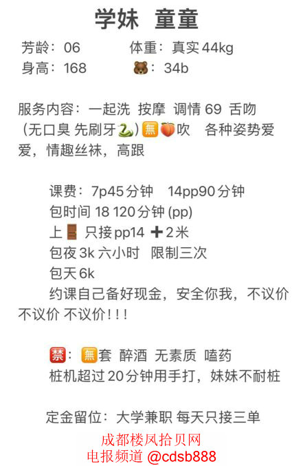 天府二街B0702童童,06年的嫩妹,有陪洗,69配合,毛少,少女感十足,情绪价值高,情趣衣服多,有Cosplay服装,可舌吻,700元一次,可包时,可上门,可包夜,可包天