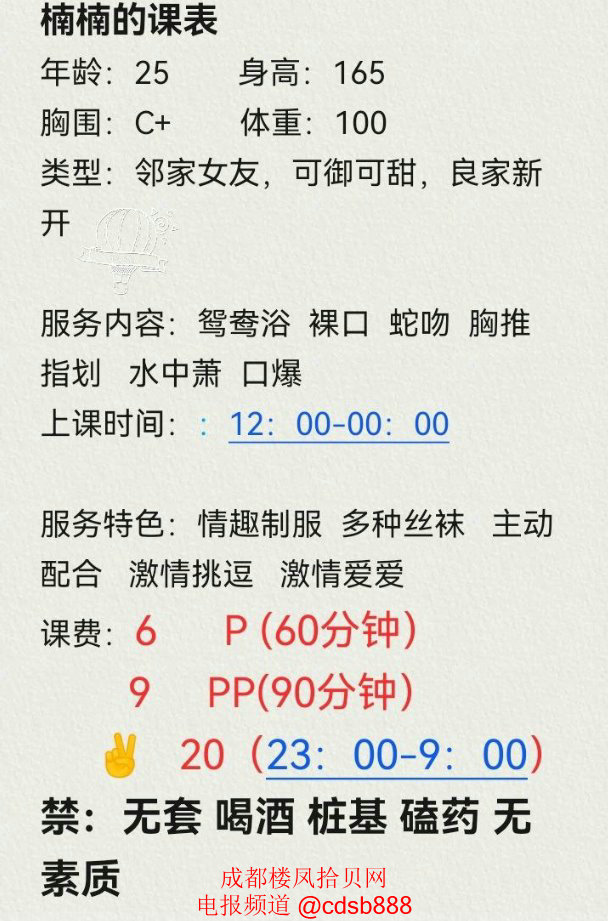 整个出击过程也比较顺畅,联系约时间找地方上楼,没有多余过场。过程体贴且很有耐心,cj体验良好,发这贴是看她佛系没什么推广,想把小姐姐留在成都,因为我还想再去。