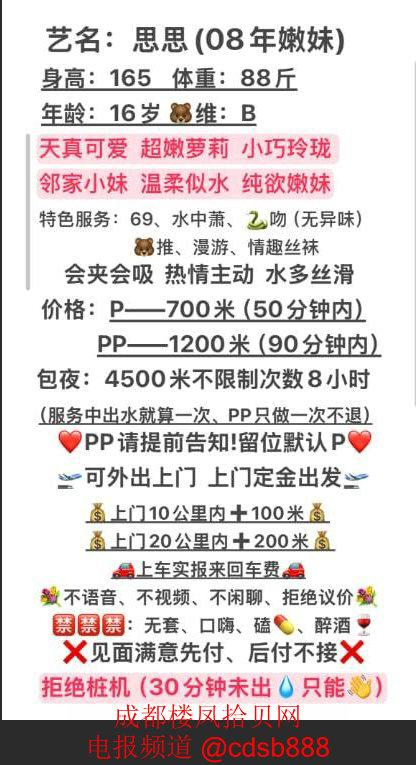 成华区E0562何仙姑处的思思,16岁嫩妹,天然白虎且户型好,身材匀称,乳头凹陷,700元一次,可包夜,可上门