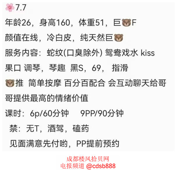 【寻欢过程与细节补充】:年假最后一天预约的77老师运气还不错定了个晚上7点30的课,到了楼下老师遥控上去一进门老师的样貌就惊艳到我了毫不夸张是我目前耍过觉得最漂亮的老师皮肤非常白其次就是那傲人的双峰,老师身高大概在165左右身材属于是比较瘦手臂和腿没什么肉感但是那对天然F给人的视觉冲击力就比较大了,老师服务不多没什么项目一起洗完澡之后换上情趣衣和丝袜就蛇吻调情吻的时候十分投入相当巴适后面开始体验老师的大胸乳交的让人飘飘欲仙一边夹一边口在这步差点就交货了让老师等了下稍作休息就开始正戏了老师帮忙戴上小雨伞就骑了上来十分主动过程细节省略,桩了大概20分钟左右吧其中换了3种姿势老师都很配合结束战斗后帮忙洗澡,总结:样貌绝对算顶级了当天老师的妆还画了腮红整个人都非常白配合那脸上的腮红给人一种小女友的感觉,蛇吻很主动随便整老师牙齿也白没异味自己注意下提前吃点薄荷糖啥的老师都不会拒绝,大胸绝对是加分项纯天然软的很总体只能说绝对值得打卡我儿豁嘛,过段时间在去回个锅