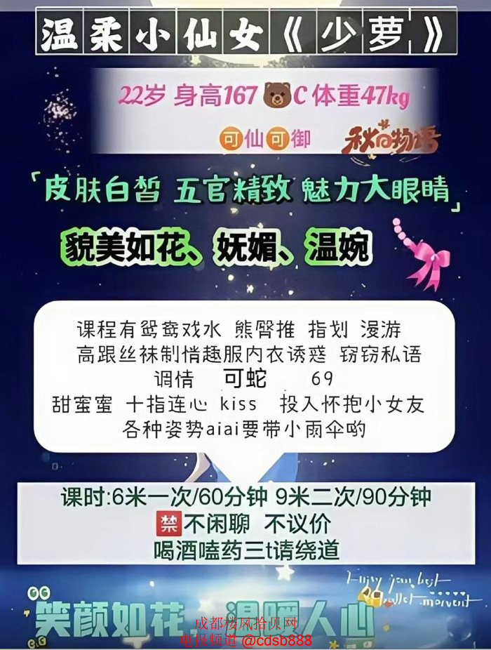 天府二街B0730少萝,长得不错,个子较高(168cm),身材高挑,逼紧水多且烫,皮肤滑,气质端庄,菜单里的服务都有,耐操,各种配合,情商高,健谈,有情绪价值,反应真实,可舌吻,逼会夹,态度好,600元一次