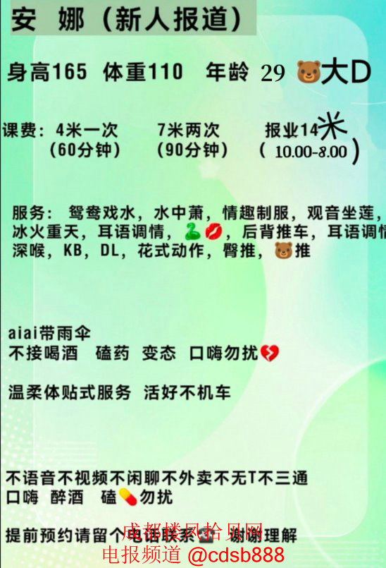 天府三街B0738安娜,30多岁的轻熟女,人照差别不大,御姐气质,身材好,胸大D罩且挺,该有的服务都有,逼会夹,会调情,可舌吻,有毒龙,400元一次,可包夜