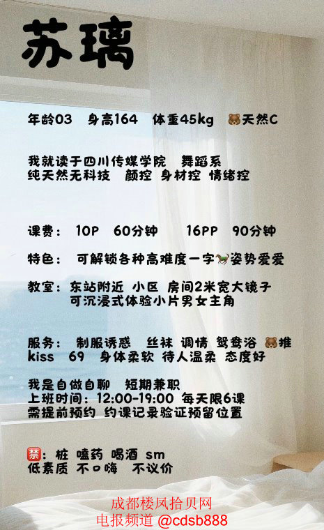 成都东站E0591苏璃,23岁的年轻妹,舞蹈专业刚毕业一年,颜值和身材都不错,大长腿,有女人味,气质好,服务认真耐心,有超大落地镜子,会一字马,健谈,逼紧水多,情绪价值高,态度好温柔,反应真实,配合度高,可接吻,1000元一次